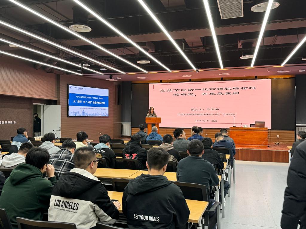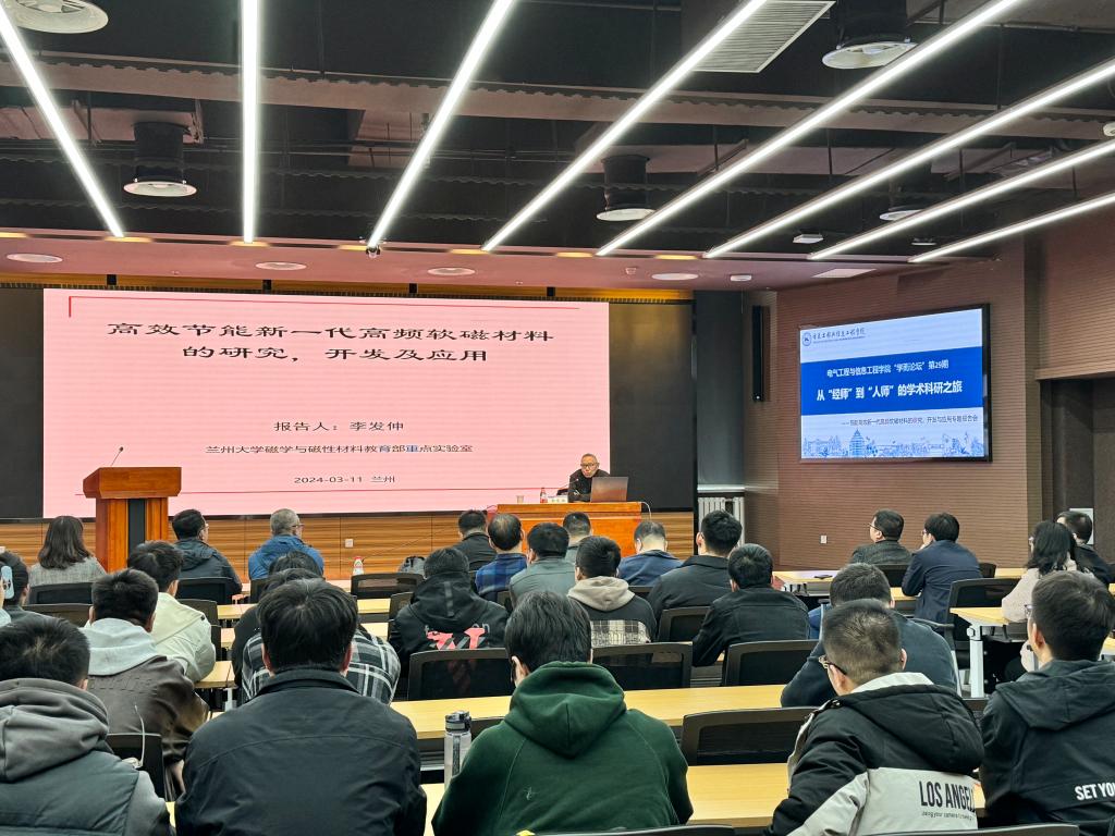 李发伸教授以“节能高效新一代高频软磁材料的研究、开发与应用”为主题,系统讲解了软磁材料的广泛应用,5G通讯技术、高频开关电源、节能减排对新一代高频低损耗软磁材料等内容,解读了科技创新对产业发展的支撑引领作用,并结合自己四十余年的从教经历,分享了个人由“经师”到“人师”,由“授业”到“传道”的蝶变历程,阐释了新时代对教师的师德师风要求。