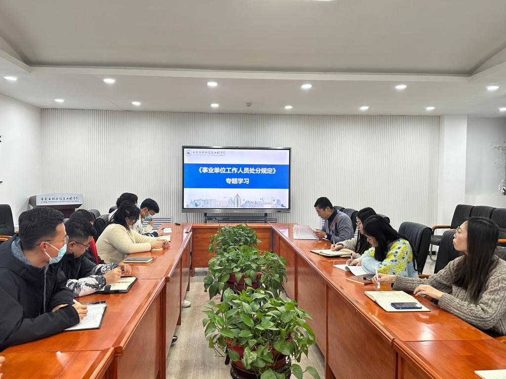 召开教职工大会,杨雅琼书记带领全体教职工学习了《事业单位工作人员处分规定》中的总则、处分的种类和适用情况、违法违纪行为及其适用的处分、处分的权限和程序、复核和申诉以及附则等部分内容。会议强调,全体教职工要加强学习,提高认识,牢记使命;要敬畏法纪,外化于行,防微杜渐;践行法规,依法依纪办事。