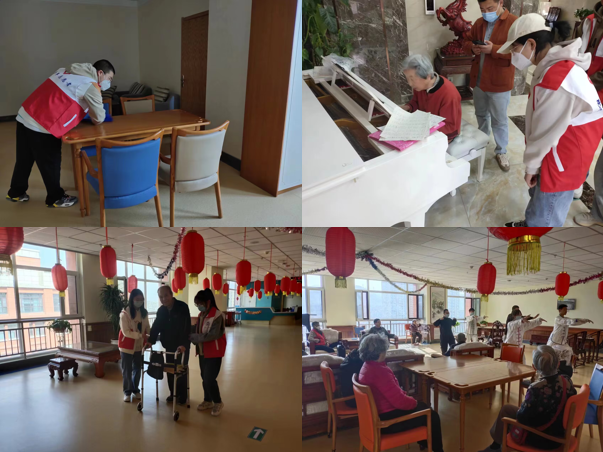 志愿者走进金益康医养中心进行系列志愿服务活动。志愿者在负责人的安排下投入到关爱老人的活动当中。志愿者们首先在老人生活活动场地里打扫卫生,扫地、拖地、收拾书架及货架等,为老人们创造了一个干净舒适的休息环境。随后在休息区看望老人,陪老人们聊聊天,分享身边趣事,畅聊生活家常。