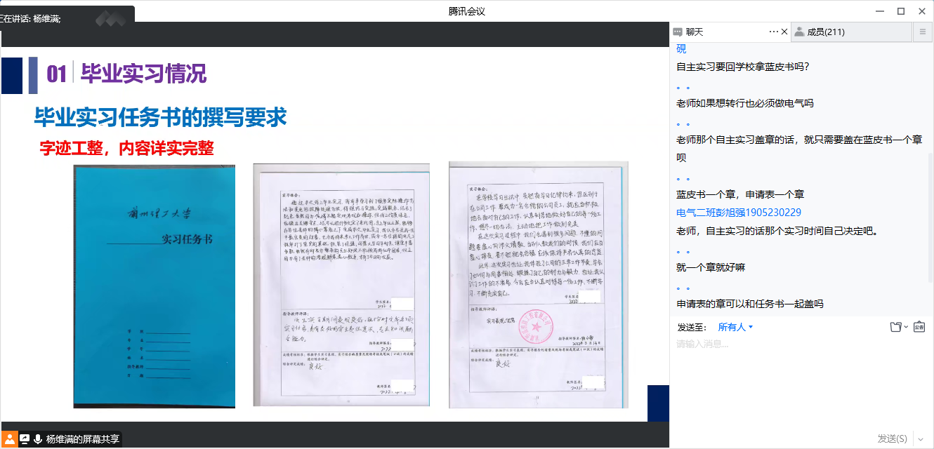 首先,杨维满老师在会上对毕业实习工作的目的、意义做了简要说明,强调大家要高度重视毕业实习工作,充分认识毕业实习的重要性,严格遵守小黄书