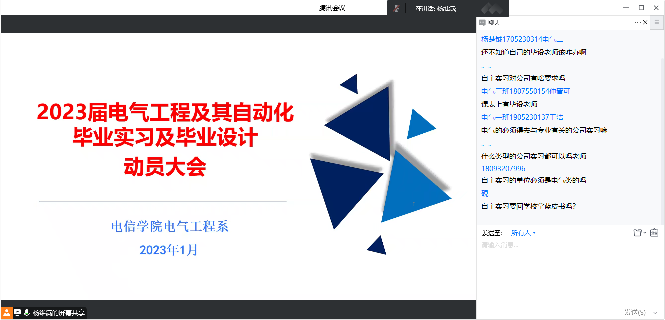 电气工程系面向2019级电气工程及其自动化专业毕业生召开了毕业实习、毕业设计线上动员大会。电气工程系副主任杨维满、实习指导老师代表郭永吉、魏占宏三位老师以及19级电气工程及其自动化专业全体学生参加了此次动员大会。此次会议由杨维满老师主持。