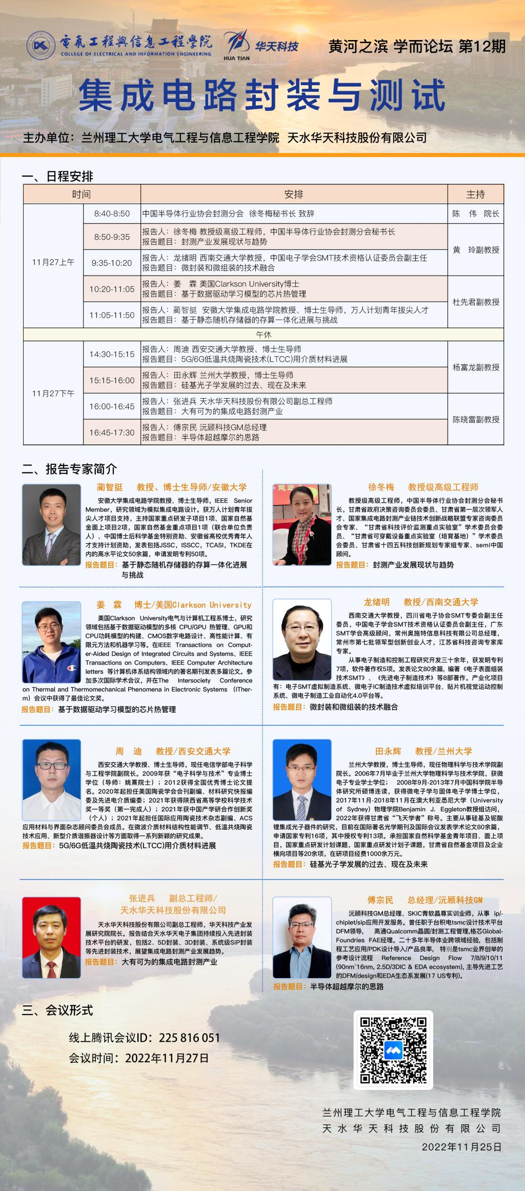 和天水华天科技股份有限公司联合举办的“集成电路封装与测试”第12期黄河之滨学而论坛于线上成功召开。会议邀请了中国半导体行业协会封测分会徐冬梅秘书长、西安交通大学周迪教授、兰州大学田永辉教授、安徽大学蔺智挺教授、西南交通大学龙绪明教授、Clarkson大学姜霖博士、天水华天科技股份有限公司张进兵副总工程师和沅顾科技GM傅宗民总经理等专家学者,共同探讨我国和我省半导体封装与测试的发展新动态、新趋势与创新技术,为集成电路未来技术小黄书