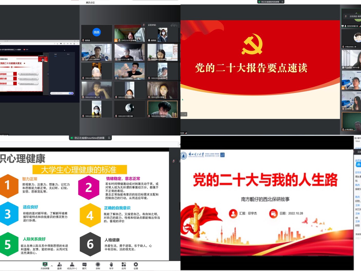 青年博士学术讲座暨2021级研究生入学教育系列活动-‘研途’生活分享”活动,确保“听课不停学”“停课不停教”;邀请校团委老师开展“快乐成长,健康生活”——2022级新生心理健康讲座,安抚因突如其来的疫情可能引起学生们的紧张、不安等情绪;开展学习“二十大精神”主题党团日活动、“党的二十大与我的人生路”研学专题活动、“同心抗疫 共克时艰”主题班会、“你好,电信”爱校主题教育等活动,变“面对面”为“键对键”,激励广大学子攻坚克难、开拓创新,引领学生坚定抗疫必胜信念。运筹帷幄,决胜千里,他们始终坚定必胜信念,云端守望,不遗余力为学校教书育人保驾护航。