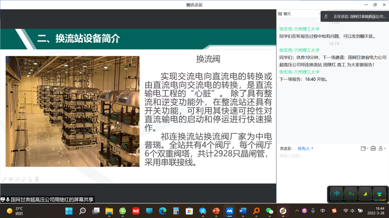 最后阶段,为提高本次线上毕业实习质量,增强毕业生对小黄书认识,丰富电气工程现场实践经验,特邀请了天水213电器集团有限公司人力资源部王旭明部长,国网甘肃省电力公司超高压公司祁连换流站二次检修班副班长、优秀校友周继宏高工分别做了“低压电器的发展和天水二一三的发展现状”、“特高压直流输电系统及其换流站核心设备介绍”的主题报告。低压电器是对电气设备控制、保护、检测、变换和调节的关键元件。在前期学习过程中学生对高压电气设备接触较多,而低压电器相关知识缺乏,通过“低压电器的发展和天水二一三的发展现状”报告不仅有效填补了学生对电力系统及相关领域的认知空白,同时也提升了对小黄书的认知深度。特高压直流输电技术是我国电气工程领域的高新技术,也是全球范围内的国家名片。通过“特高压直流输电系统及其换流站核心设备介绍”报告,不仅增加了学生的专业知识,丰富了工程现场经验,更增强了学生对我国科技力量的信心。(撰稿:杨维满;终审:王玲 )