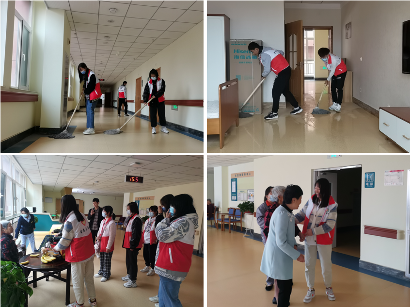 志愿服务在负责人的安排下投入到关爱老人的活动当中。首先志愿者们在生活场地里打扫卫生,扫地、拖地、收拾书架及货架等,为老人们创造了一个干净舒适的休息环境。随后志愿者们在休息区看望老人,陪老人们聊聊天,分享身边趣事,畅聊生活家常。还有的同学教老人如何使用手机里的新软件,如何利用手机网络搜索自己想了解的新闻。志愿者与老人们的亲切交流,让老人们感受到了亲人般的关怀。最后进行了文艺表演,欢声笑语充满了整个敬老院。三个小时的志愿者活动时间转瞬即逝,留影过后,同学们与老人们一一告别。