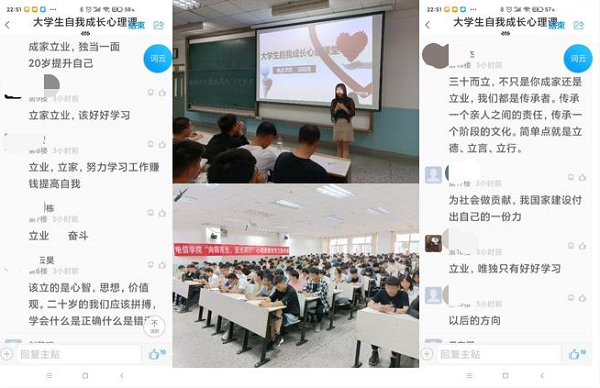段晓燕老师发出讨论“三十而立我们立什么?作为现在的我们可以做些什么?”参与活动的同学们积极参与了讨论,也引发了同学们的思考。通过段老师的分享,同学们更加懂得心理健康的第一条标准就是认识自我、接纳自我,能体验到自己存在的价值,并且乐观自信,唯有如此才能以信任、友爱、宽容、尊重的态度与他人相处,能分享、接受、给予爱和友谊,也能与他人同心协力完成项目任务。