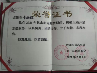 李炳毅说:“我的家乡石家庄在今年成为了严重的疫区之一,作为一个石家庄人,做为一个共青团员,我觉得我有责任也有义务为石家庄的防疫工作贡献自己的一份力量。今年石家庄市进行了三次全员核酸检测,我所在的长安区更是进行了五次核酸检测,社区工作人员人手不足,而我的工作就是维持检测人员的秩序,录入检测信息。虽然做志愿者时非常累,心理压力也很大,但全市人民共克时艰,石家庄最终战胜了疫情,迎来了解封,我感到来自内心深处的高兴与骄傲。”