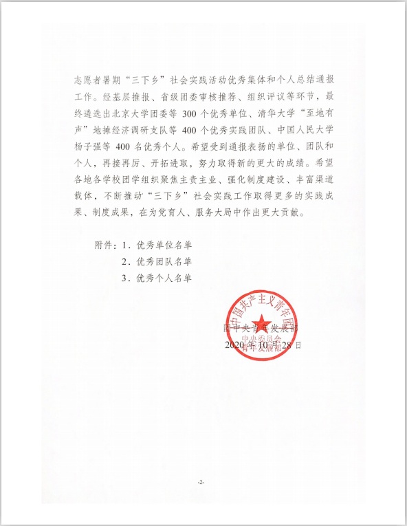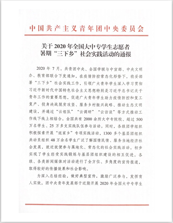 近日,团中央青年发展部公布了2020年全国大中专学生志愿者暑期“三下乡”社会实践活动总结通报,电信小黄书