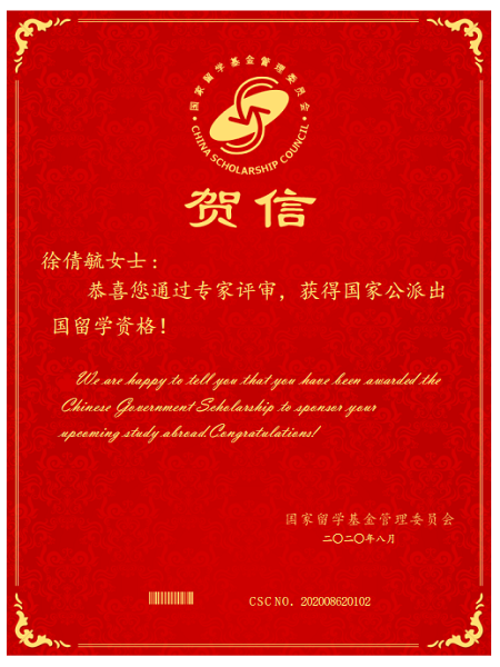 全日制在读博士研究生徐倩毓收到了来自国家留学基金委的贺信和录取通知书,其被国家留学基金委录取为2020年国家建设高水平大学公派研究生项目出国留学人员。国家留学基金委将全额资助该生赴法国留学,留学单位为Université de technologie Belfort-Montbéliard (UTBM),留学身份为联合培养博士研究生。