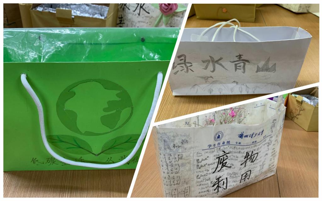 选拔赛,呼吁同学们利用废弃的外卖包装,制作环保袋、环保盒等,变废为宝,对废弃包装进行二次利用,增强学生环保意识,培养爱护环境的环保习惯,为建设“绿色中国”做出贡献。2019级自动化一班赵鸣一、19级机器人工程何玉荣、李轲、代龙等同学分别获得了小黄书