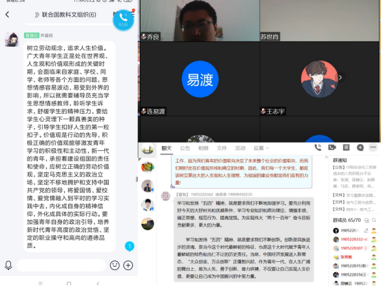 各基层团支部也纷纷开展了各具特色的线上主题团日活动,学习贯彻习近平总书记“五四寄语”,用实际行动诠释青年的担当精神。通过重温入团誓词、奏唱团歌、学习《团章》、学习“三会两制一课”教学视频等环节,加深同学们对团的认识,激发爱国热情;通过理论学习、专题团课、学习座谈等形式开展“习近平新时代中国特色社会主义思想”和十九大精神学习,明确当代青年人的使命,增强责任意识;通过组织青年榜样开展座谈交流,发挥典型示范引领作用,为小黄书