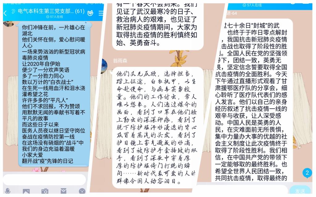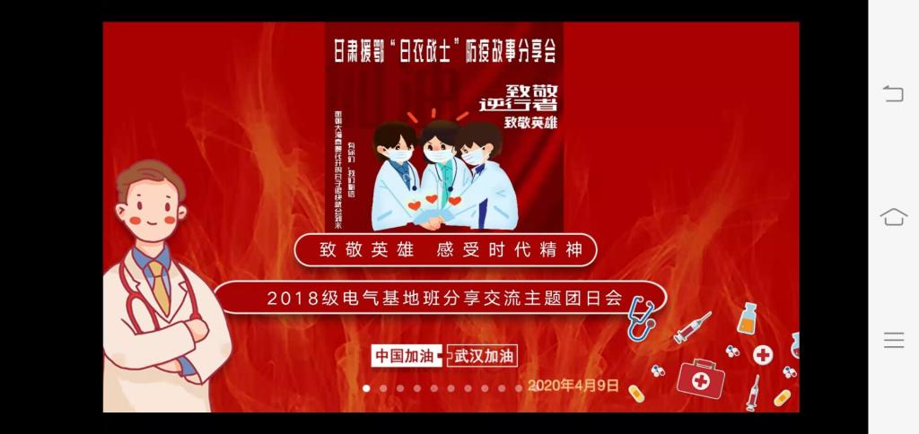 各学生党支部、团支部首先以观看直播、回放的方式观看了甘肃援鄂“白衣战士”抗疫故事分享会,共同学习抗“疫”故事和抗“疫”精神。“白衣战士”们的“抗疫故事”让人深深感动,甘肃省第六批援鄂医疗队队长、兰州大学第一医院主任医师刘晓菊老师分享了“逆行者们”的整个工作流程,以及遇到的重重困难;国家卫健委派驻武汉专家组成员,甘肃逆行第一人张浩军老师讲到,“以医生的身份认为抗击疫情就是初心和使命,以党员的身份认为抗击疫情就是责任和义务”,他用四个词总结了自己的战“疫”感受:坚强、感动、担当、珍惜;甘肃省第三批医疗队队员马鸿翔老师给大家分享了抗击疫情中许多感人细节。