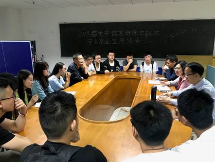 向2019届毕业生顺利毕业表示衷心祝贺,并鼓励大家积极发言。会上,毕业生代表畅所欲言,针对专业课程体系建设,实践环节建设及考研就业等方面提出了一些建设性意见。毕业生代表建议,加强实践课与专业导论课建设,教学中强调专业与实际应用的联系,有利于提高学生对本专业的兴趣;强调和鼓励低年级学生参加各种竞赛,有利于提高学生就业竞争力;鼓励学生考研、积极参加研究生招生宣讲会等。毕业生提出的建议真切地反映了他们对电子系专业建设更上一层楼的美好愿望,也寄托了他们对学弟学妹充实度过本科时光的殷切希望。