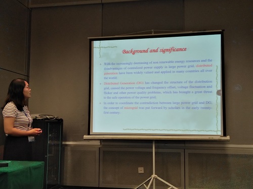 由于收到大会报告的邀请,我院2016级硕士研究生王晓婷为本次参会代表进行口头汇报,汇报专题是Smart Grid,论文题目是Tertiary Control Strategy for Optimal Voltage Unbalance Compensation in Island Microgrid,主要是孤岛微网由不对称负荷引起的电压不平衡问题,提出采用分层控制的方法实现电压不平衡分层分区优化补偿。其中,一次和二次控制层,主要实现公共耦合点(point of common coupling ,PCC)的电压不平衡补偿;二次控制层,调节电压和频率偏差,以实现电压不平衡控制和功率的精确分配。三次控制层,采用ABC优化算法获得最优的三次补偿增益,调整分布式电源(Distributed Generator,DG)输出功率参考值。以此满足不同区域和母线对电能质量的要求通过在会场上与各位学者的交流,使学生意识到了自己所做的还远远不够,应当深入钻研,争取做到将问题彻底解决,经过这次会议,获益匪浅。