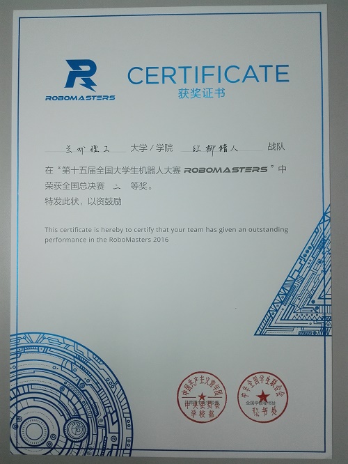 我校RoboMasters2016获奖证书