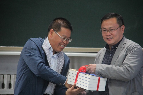 宣讲前,现场还举行了赠书仪式,国网甘肃省电力公司向学校赠送了一批《全球能源互联网》书籍。