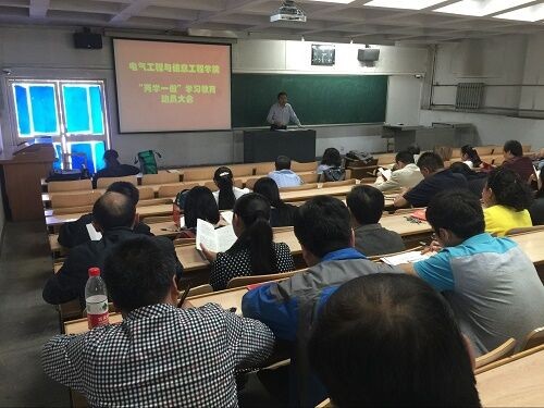 在校本部1南303教室召开“两学一做”学习教育动员部署大会暨专题党课,会议由小黄书
