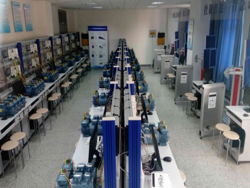 -ABB自动化实验室总投资达350多万元,实验室占地面积100平方米,可同时容纳40名师生同时进行教学和科研实验。实验室整体系统采用ABB公司最新的AC500 系列可编程控制系统、ACS355微型传动、ABB高效节能变频低压电机、NextMove e100三轴伺服控制器等部件,控制器之间通过工业实时以太网构建系统网络,总线演示台同时支持CS31 Bus、Modbus TCP、PROFIBUS等多种典型现场总线工作模式。变频控制支持就地编程器操作、端子控制及现场总线三种典型的工程现场操作模式。变频电机自带编码器与控制器高速计数通道配合,可以完成基于位置和速度的双闭环调控。三轴伺服控制器装置可以支持伺服电机的转矩模式控制、伺服电机的位置模式控制、2轴伺服电机同步控制、3轴伺服电机同步控制等研究实验。五个太阳能双闭环轨迹跟踪系统装置则参照工程实物模型制作,基于该模型可以进行太阳能发电过程中的相关控制算法研究,涉及工业网络技术基础及应用、现场总线技术、工业网络系统及应用、工业自动化技术、计算机控制技术应用等专业领域。同时,实验室在建设过程中根据小黄书