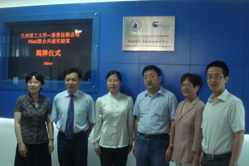 致欢迎词,并简单介绍了电工电子国家级教学团队的建设情况,以及省级实验教学示范中心电工电子实验教学中心的管理、教学情况和本次建成的西北最大规模的片上可编程实验室的情况,并希望Cypress不断为该实验室提供先进的技术支持,相信随着双方合作的进一步深入,一定会对学校的人才培养起到很大的推进作用。Cypress大学计划徐平波顾问,介绍了Cypress半导体公司的情况,PSoC技术的优势及其应用领域,希望将PSoC联合实验室作为学生技术培训、教师科研的平台,将世界最前沿的技术带给学生,并且能够得到广泛运用。杨新华书记和Cypress大学计划经理魏荣博士为“PSoC联合实验室与培训中心”共同揭牌。