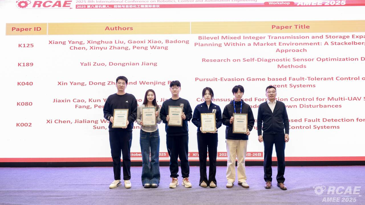 师生前往西安,参加第八届机器人、控制与自动化工程(RCAE2025)国际会议,会议由IEEE、IEEE Robotics & Automation和西安工业大学主办,西安交通大学、西北工业大学、西安电子科技大学、长安大学等联合承办。会议采用线下线上融合模式,吸引全球500余位专家学者、工程技术人员及研究生代表参会,为控制领域的各位学者,提供了一个关于机器人控制与自动化工程最新进展的交流与传播平台。