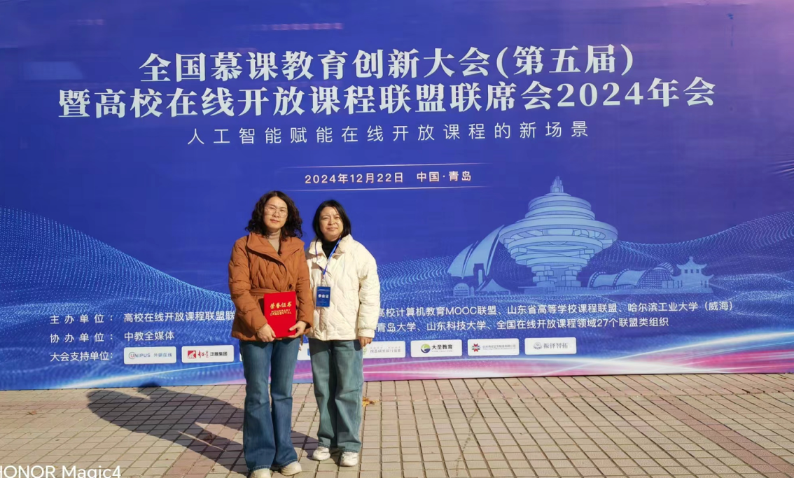 教师鲁春燕、苏敏老师参会。本次大会由高校在线开放课程联盟联席会主办,高校计算机教育MOOC联盟、山东省高等学校课程联盟、哈尔滨工业大学(威海)、青岛大学承办,中教全媒体协办。大会主题为“人工智能赋能在线开放课程的新场景”,旨在贯彻落实国家教育数字化战略行动,紧抓高等教育数字化转型的时代浪潮,系统研讨慕课与在线教育新动向、数字技术赋能在线开放课程新发展,推动我国在线开放课程在数智时代的发展形态创新。