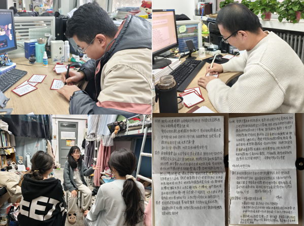 全体辅导员、学生代表征集手写考研祝福明信片,为考研学子送上满满的祝福。除此之外,辅导员采用集中谈心和深入宿舍相结合的形式对部分因备考心理压力增大的学生进行心理疏导,帮助他们理性对待考研压力,明确考研意义,做好时间管理和心态调整。老师们通过叮嘱考前注意事项,询问备考进度与当前状态,鼓励同学们在即将到来的考试中,调整心态,保持良好的学习习惯,规律作息,以饱满的热情和坚定的决心迎接考试。
