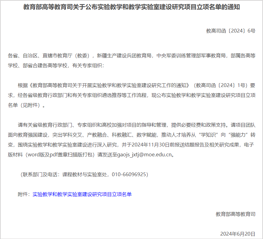 6月20日,教育部发布《教育部高等教育司关于公布实验教学和教学实验室建设研究项目立项名单的通知》(教高司函〔2024〕6号),我院丁守成教授团队负责申报的《“科教融汇、数字赋能”地方高校实验教学体系构建与实践—以电气与控制工程国家级实验教学示范中心为例》项目获得立项。